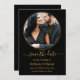 Modern Elegant Round Photo Frame Save The Date Couple Photo Wedding Engagement Announcement Card - Black with Gold Text