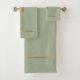 Trendy luxury exclusive looking monogrammed bath towel set featuring a faux gold copper metallic glitter square and lines over a stylish classy light olive sage green background. + Personalize it with your name or family name and monogram name initial.