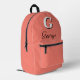 A personalised monogram backpack designed in a modern elegant style. This elegant Salmon backpack features a bold white initial 'G' with a black shadow and a customisable name in black script font. Perfect for adding a touch of sophistication and personalisation to your everyday style. Ideal for school, work, or casual outings, this backpack combines functionality with a chic design that stands out.