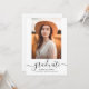 Celebrate your graduate's achievement with this modern and elegant script 2023 graduation photo invitation. The invitation features a beautiful and modern calligraphy script along with a photo of your choice. This invitation is perfect for both high school and college graduations, and can be customised to fit your unique style. Let your loved ones know that you're throwing a grad party that they won't want to miss with this stunning invitation!