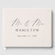Elegant wedding guestbook featuring "Mr. and Mrs." displayed in a modern black calligraphy script on a cream background. Personalise the front of the simple wedding guest book with your last name and wedding date. The back of the cream guest book displays your horizontal engagement photo. Add your married name and wedding date to the spine of the photo guest book.