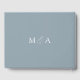 Elegant wedding guestbook featuring "Guest Book" displayed in a modern white calligraphy script on a dusty blue background. Personalise the front of the simple wedding guest book with your names and wedding date. The back of the dusty blue guest book displays your monogram initials. Add your married name and wedding date to the spine of the guest book.