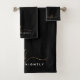 Personalised towel set (or individual pieces) with simple, elegant handwritten calligraphy script initials or monogram and name in gold and white against an editable black background for a stylish look. CHANGES: Change the background colour, choose a styled graphics background or change the text font style, colour, size and placement by clicking EDIT in the PERSONALIZE section for a custom design. ASSISTANCE: For help with design modification or personalisation, colour change, resizing or transferring the design to another product, contact the designer BEFORE ORDERING via the Zazzle Chat MESSAGE tab below or email makeitaboutyoustore@gmail.com.