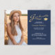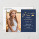 This double sided 2 photo stylish graduation announcement or thank you postcard, features modern text fused with elegant calligraphy script in gold colour and white on navy blue. Photos are one on the front and one on the back. To see more items like this, visit my store here at "www.Zazzle.com/LakeViewCardCo". Thanks