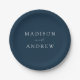 The elegant, personalised navy wedding paper plates are perfect for your wedding reception, rehearsal dinner, engagement party, and more! The minimalist navy wedding plates are perfect for summer, fall, winter, and spring weddings. The design features a chic modern calligraphy script with your names in white lettering on a navy background. The design coordinates with our Modern Elegance Navy wedding collection.