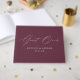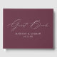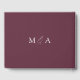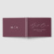 Elegant wedding guestbook featuring "Guest Book" displayed in a modern white calligraphy script on a purple background. Personalise the front of the simple wedding guest book with your names and wedding date. The back of the purple guest book displays your monogram initials. Add your married name and wedding date to the spine of the guest book.