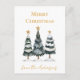 Spread holiday cheer with this elegant, watercolor Christmas postcard. The design features three unique snow-covered Christmas trees, each topped with a delicate golden star. This charming winter scene is perfect for sending warm holiday greetings to family and friends. The elegant "Merry Christmas" message paired with a personalised, handwritten signature adds a sophisticated touch. This postcard is the perfect way to share your holiday joy.