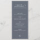 Let your wedding party guest know whats on the wedding reception celebration menu with this minimalist menu design featuring elegant white typography script above with decorative romantic birds above the word "Menu", a line drawn heart at the bottom and all inside a clean thin white border. The background is rustic blue to finish the clean and simple look. There is also space to add the wedding names and date.