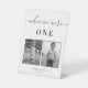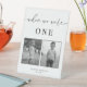 Modern, elegant wedding table number pedestal sign features a minimalist black and white design. The table number corresponds to the age of the couple and features black and white photos of them at that age. Personalise with your names and wedding date with the easy to edit template featuring an elegant script font and classy serif font. Create as many table numbers as you need by changing the "one" to your desired number, swapping the photos for your own, and add 1 item to your cart. Repeat for as many table numbers needed.