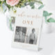 Modern, elegant wedding table number pedestal sign features a minimalist terracotta orange design. The table number corresponds to the age of the couple and features black and white photos of them at that age. Personalise with your names and wedding date with the easy to edit template featuring an elegant script font and classy serif font. Create as many table numbers as you need by changing the "one" to your desired number, swapping the photos for your own, and add 1 item to your cart. Repeat for as many table numbers needed.