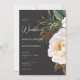 Our charcoal black wedding invitation with a striking white peony, soft yellow centre, lush greenery, and delicate cotton bolls is a modern masterpiece. The crisp white text adds a touch of elegance, while the dark background creates a dramatic backdrop for your special day. This design is a breathtaking blend of modern elegance and timeless romance. Created by Simply Farmhouse Press.