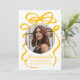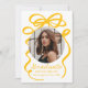 Celebrate your graduate’s achievement with this stunning graduation announcement, featuring a bold yellow bow and ribbon design on a white background. The graduate’s circular photo is beautifully framed by the bow, while "Graduate" shines in an elegant handwritten yellow script. Personalise with the graduate’s name, school, and graduation year for a unique and memorable touch. The back includes an additional photo and space for a custom message, making this design perfect for high school and college graduates. Share this special milestone with a bright and sophisticated keepsake!