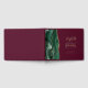 This elegant wedding guest book features an emerald green watercolor agate design trimmed with faux gold glitter. Easily customise the gold-coloured text on a burgundy red background, with the names of the bride and groom in whimsical handwriting calligraphy over a large ampersand. Add additional text of your choice to the front and spine.