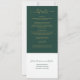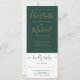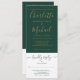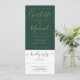 An all in one wedding invitation featuring modern signature script names and elegant gold typography on an emerald green background. The invitation includes an RSVP card that can be cut off and guest information details. Designed by Thisisnotme©