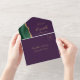 The left-hand edge of this elegant modern all-in-one wedding invitation and RSVP features an emerald green watercolor agate border trimmed with faux gold glitter. The customisable text combines gold-coloured whimsical handwriting script, copperplate and italic fonts on a purple background. The return address appears on the outside flap and the reverse side of the detachable RSVP card in gold-coloured text on solid purple.