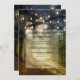 An elegant wedding invitation featuring a path in an enchanted forest with festive string lights.