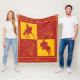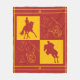 A bold and modern equestrian design in firebrick red and warm yellow featuring the silhouettes of a dressage and a showjumping horse with riders juxtaposed with equestrian tacks such as a saddle, a whip, riding boots, a helmet, and a horseshoe. Personalise the fleece blanket with your monogram or initials and make it uniquely yours. This is a great home decor item for a horse lover or an avid equestrian.