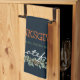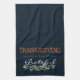 Modern very dark blue Thanksgiving kitchen decoration mixing different fonts and colours, featuring beautiful watercolor eucalyptus branches with burnt orange buds, adding to the customisable typography Thanksgiving, time for caring, sharing and feeling grateful. The dark blue background provides contrast and adds to the modern feel to the kitchen towel. A beautiful fall decor and accent piece that shows your appreciation, gratitude and says thanks for all the blessings in our lives.
