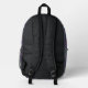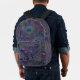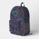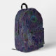 This customisable printed backpack boasts a vibrant and dynamic graphic style. The all-over print features stylised foliage in captivating shades of purple, pink, blue, and green. The leaves appear to dance across the fabric, creating a lively and modern botanical aesthetic. At the top centre, a circle awaits personalisation—the perfect spot for adding a name, monogram or custom text.