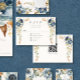RSVP Response card with QR code (or delete that field if not needed). Loose watercolor style botanical floral design with pale dusty navy blue and white wild rose floral in with warm muted leaf foliage greenery. The reverse side has your QR code and text. You can delete the text in those fields if you don't need them. A complete set of products are available for purchase in the collection. MSP0102