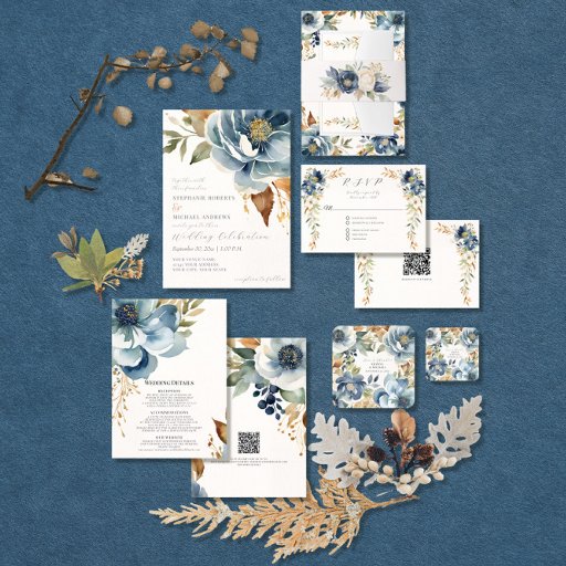 Modern Fall Floral Navy Dusty Blue Ivory Wedding Invitation