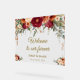 Add a touch of sophistication to your special day with this modern fall wedding welcome sign printed on durable, crystal-clear acrylic. Designed with elegant watercolor burgundy roses, burnt orange dahlias, eucalyptus greenery, and golden autumn leaves, this sign beautifully blends rustic warmth with contemporary style.