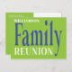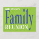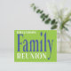 Bold, eye catching neon green, neon blue and white family reunion postcard invitation. Invite your family to gather and attend a family reunion picnic, barbecue, beach party, cruise or other event. Add your event details to the address side of this family reunion postcard.