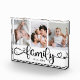 Modern custom photo collage block with space for 3 photos surrounding a trendy swirly script reading FAMILY and your custom name below.