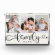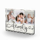 Modern custom photo collage block with space for 3 photos surrounding a trendy swirly script reading FAMILY and your custom name below. This is the charcoal grey and ivory version.