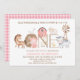 Cute farm themed birthday invitation for a first birthday for a little girl featuring various farm animals and and the word one. This farm invitation design is a cute way to set the scene for a farm themed girl's first birthday party.
