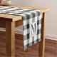 Custom-designed farmhouse style table runner featuring personalised monogram and family name on festive black and white buffalo plaid/gingham/check pattern.