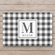 Custom-designed farmhouse style doormat featuring personalized monogram and family name on festive black and white buffalo plaid/gingham/check pattern.