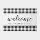 Custom-designed farmhouse style welcome doormat featuring personalised family name on festive black and white buffalo plaid/gingham/check pattern.