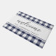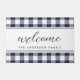 Custom-designed farmhouse style welcome doormat featuring personalised family name on navy blue and white buffalo check pattern.