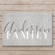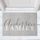Custom-designed doormat featuring personalized monogram/family name in modern hand calligraphy printed on a rustic farmhouse style polka dots background.