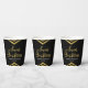 These modern paper cups feature elegant geometric chevron and the word "Sweet Sixteen" in faux gold foil against a black background.