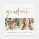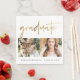 Modern and chic graduation party napkin with faux gold graduate script typography, two photos, name and class year in black text on a white background.