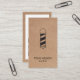 Elegant fully customisable business card template with PRINTED kraft paper background, black barber pole pin. Modern elegant design for barber salon.