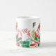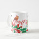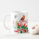 Warm up the Christmas season with this cheerful holiday mug featuring a female cardinal and festive holly in red and green on both front and back with a modern black monogram on a white background. Makes a great personalized gift for her. Designed by © Tim Coffey.