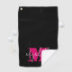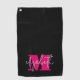 Create a golf towel with your custom monogram and name on it. This feminine and fun towel feature a hot pink monogram initial and your first name in white on a black background. MATCHING items in our store.