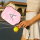 This modern, feminine monogram pickleball paddle features a trendy pink watercolor background. Personalise it with your initial and add your name in a black signature handwriting script. Complementary items are available. Order yours today!