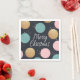 A modern Christmas napkin with colourful festive - gold glitter, pink, and blue - dots. The phrase "Merry Christmas" is set in an whimsically handwritten font.
