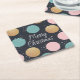 A modern Christmas coaster with colourful festive - gold glitter, pink, and blue - dots. The phrase "Merry Christmas" is set in an whimsically handwritten font.