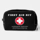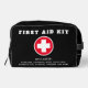 Elevate your safety with this simple, modern red, black and white first aid Dopp kit, a compact lifesaver for emergencies. Personalise your name and medical information on the front for easy identification. On the reverse, find a detailed list of included essentials such as bandages, antiseptic wipes, and medications, all labelled for quick access. Embellished with a prominent red and white cross, this kit stands out for its functionality and style. Designed for versatility and peace of mind, it's your go-to companion for every journey.