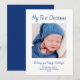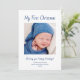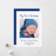 Modern First Christmas greeting card, with a cute baby boy theme and customisable blue typography lettering. With a photo template, you replace with your own baby photo. Great for announcing your new addition this holiday season.