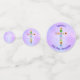 Modern and abstract First Holy Communion illustration featuring a cross with minimalist First Holy Communion symbols on a watercolor pastel lavender tourquoise background.