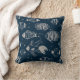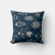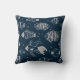 A cute square throw pillow with a rich pattern of fish swimming in dark blue water, sketched in a modern linework.