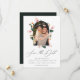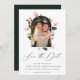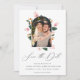 Modern arch frame, save the date photo card. Frame is adorned with tropical watercolor foliage, flowers and orange citrus fruit. Elegant "Save the Date" calligraphy graphic and coordinating dark green colour backing.
