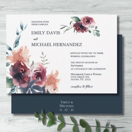 Elements: watercolor floral elements: roses, peonies, greenery eucalyptus, foliage. Serif fonts with lively script accents Colours: burgundy, maroon, marsala, raspberry, cranberry, mulberry, pink, blush, peach, dusty blue, green, blue green, navy blue, slate blue. Themes: modern, floral, botanical, contemporary, chic, classic, garden, simple, boho, country, vinyard, winery. Collection: Modern Floral Burgundy Navy Peach Blush Wedding Collection. Product Type: Program