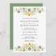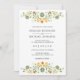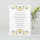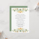 Artistic wedding invitations featuring a top and bottom border with yellow, orange and teal flowers, vines and leaves over a white background. Your details are in the middle of the two borders, in a sans serif. The backside is green and may be changed to any colour that you wish. This design is great for a garden wedding in the summer.